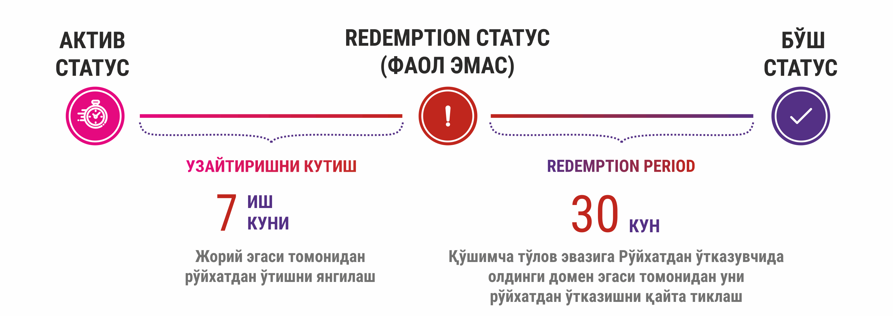 Redemption period - домен маъмуриятининг ушбу домен номини келгусидаги маьмурлаш ҳуқуқларини тиклаш даври ҳисобланади. Агар доменлар белгиланган узайтириш муддатига қадар узайтирилмаган бўлса, домен чиқарилган санадан сўнг улар "Redemption period" даврига тушади. Ушбу давр мобайнида домен эгаси домен номига бўлган ҳуқуқини қўшимча тўлов эвазига Рўйхатдан ўтказувчи орқали қайта тиклаши мумкин. "Redemption Period" даври пайтида, олдинги домен эгаси, ўз хохишига кўра, белгиланган тартибда Регистраторни ўзгартириши мумкин.